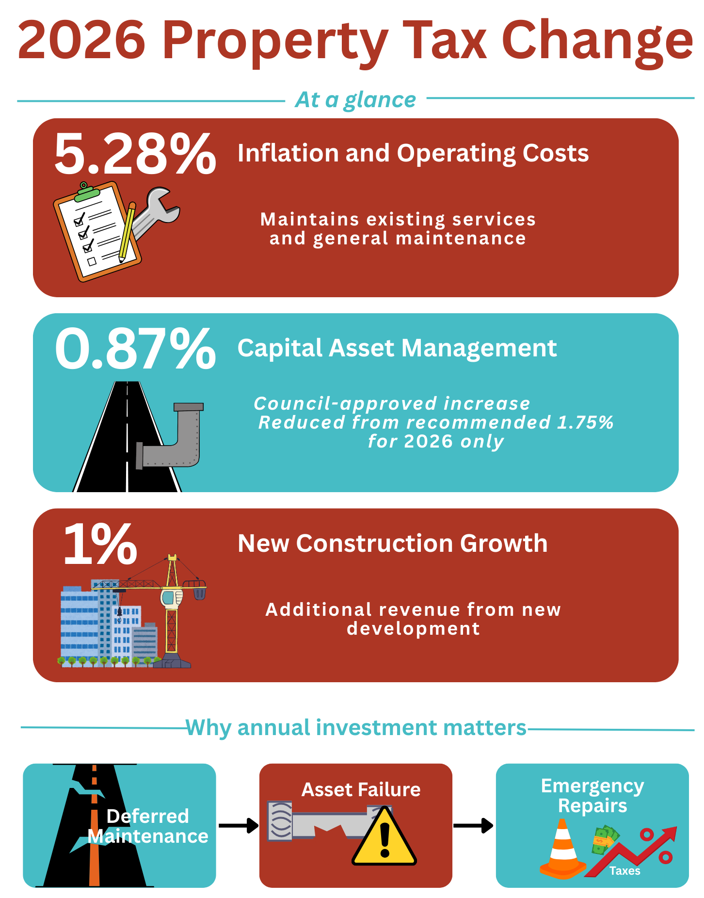 A 1.75% increase has been recommended to address capital asset management and replacement. Municipal assets are publicly owned infrastructure that municipalities are responsible for managing, such as roads, water pipes, parks, sewage collection systems, vehicle and equipment fleets, and more. If taxes are not increased each year to account for inflation, the City would have to reduce maintenance budgets or defer major capital works. This could result in the failure of an asset, which then would require higher future taxes to pay for emergency repairs or replacement. Eventually the deferred major capital works must be done, which would again result in higher future taxes to do the works that should have been done. City Council voted to reduce the recommended increase by half and only do an increase of 0.87% for 2026 only, to keep the tax increase lower.