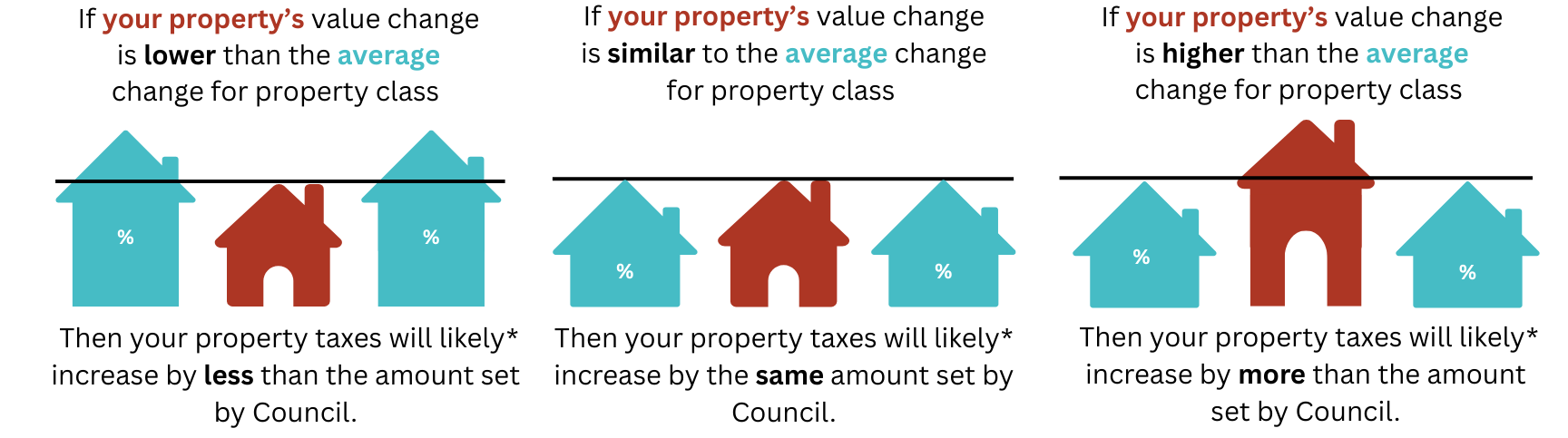 An increase or decrease in your property assessment does not mean your taxes will automatically go up or down by the same amount.
