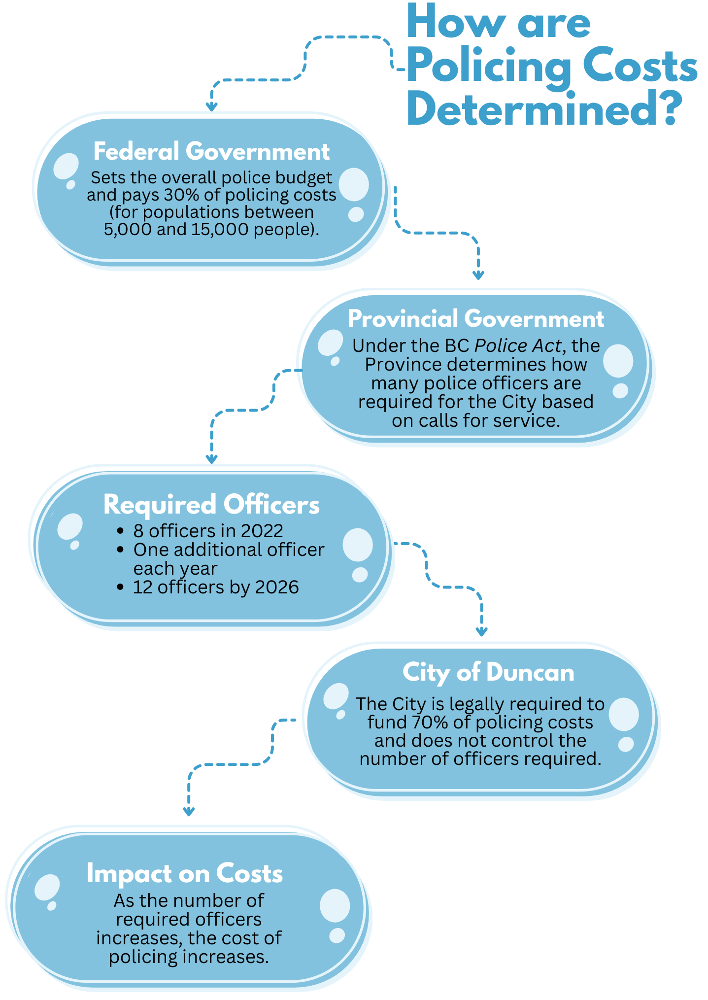 In British Columbia, the provincial government is responsible for providing policing and law enforcement to municipalities with a population of under 5,000. In 2021, the City’s population surpassed 5,000. Under the BC Police Act, this required the City to pay for 70% of its policing costs starting in 2022, with the federal government paying the remaining 30%. The provincial government is responsible for determining how many police officers are required for the City, and the federal government is responsible for setting the police budgets. Based on the number of calls for service in this area, the provincial government required the City to fund eight officers in 2022, increasing by one officer each year until reaching 12 officers in 2026. The City must also contribute proportionally to the operating costs of the North Cowichan/Duncan RCMP detachment building, administration, and equipment. |  |